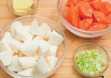 3胡蘿卜洗凈,去皮後切小塊。山藥去皮,洗凈,切小塊。蔥切碎,薑切片。