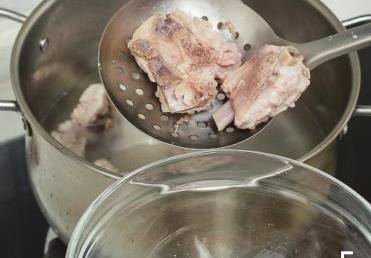 5繼續煮3分鐘左右,將排骨撈起洗凈。