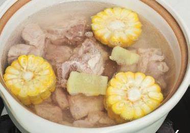 6取砂鍋,放入排骨、玉米、薑片、料酒和適量清水,大火煮開。