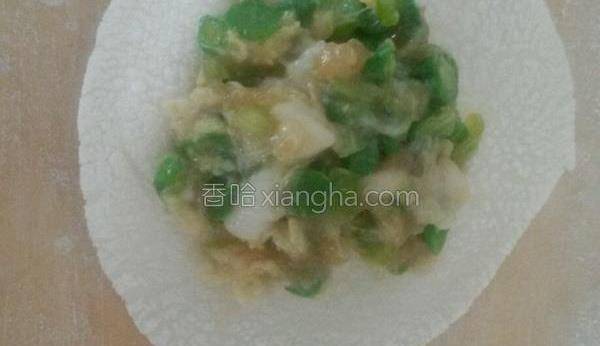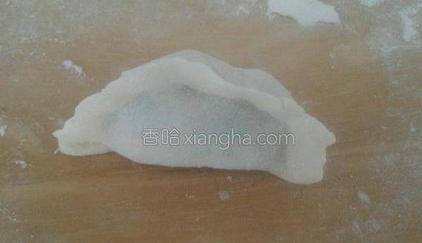 8.取適量餡料放面皮上,兩邊對折,依次捏合。