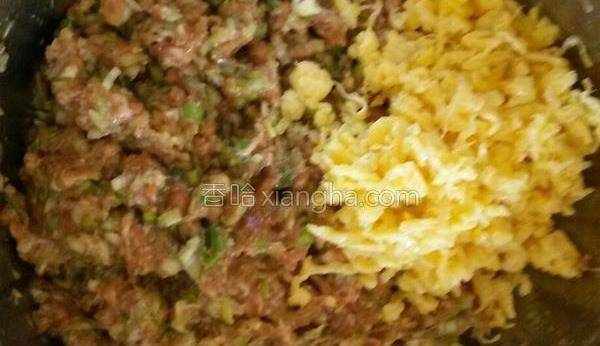3.2個雞蛋炒成雞蛋碎塊放進肉餡中。
