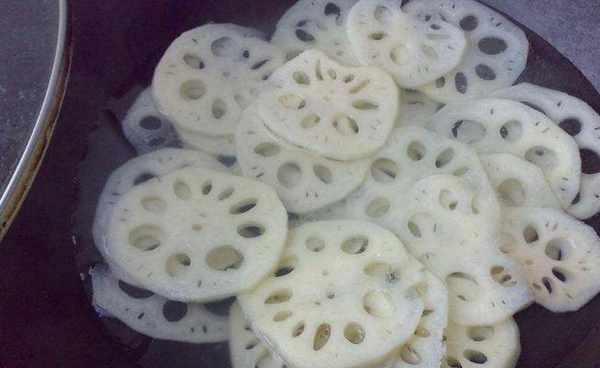 3、然後再將蓮藕放到鍋裡焯一分鐘左右,撈出瀝幹水分。