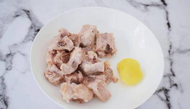 把排骨斬成小塊,冷水下鍋放入排骨焯去血水後撈出用清水沖洗幹凈備用,薑切片