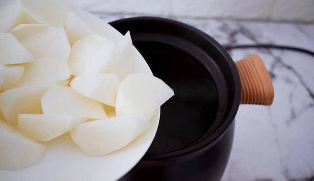 白蘿卜去皮洗凈切成小塊,等燉煮時間剩下20分鐘時加入白蘿卜,蓋上鍋蓋,坐等湯煲好