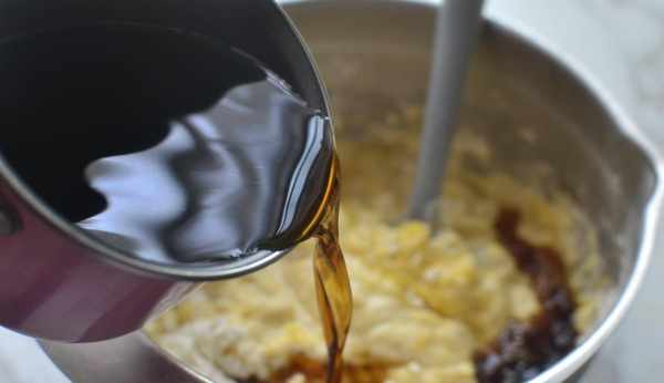 然後慢慢倒入冷卻的紅糖水(邊倒邊攪拌以免有顆粒)