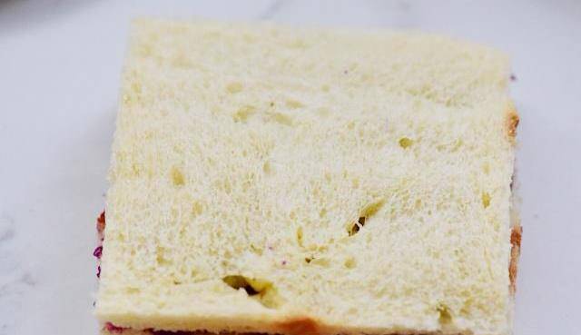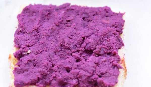 4、取一片吐司抹上均勻的紫薯泥。