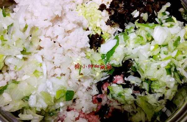 2、將木耳溫熱水泡開,然後木耳,蓮藕,荸薺,包菜,大蔥分別洗凈剁碎備用。
