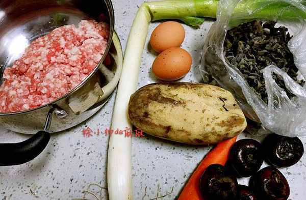 1、準備餡料:鮮肉末,雞蛋兩個,蓮藕一小節,大蔥一根,木耳一小把,荸薺幾個,包菜小一個,胡蘿卜一小根。