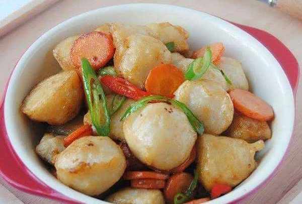材料:墨魚丸,青椒,紅辣椒,胡蘿卜,醬油,大蒜,鹽油