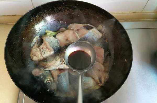 5、然後放入生抽,轉動炒鍋讓調味品和魚塊混合均勻;