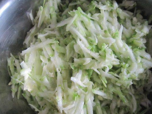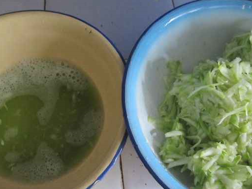 4、將西葫蘆絲擠幹水分備用,擠出來的水不要扔,用它來和面