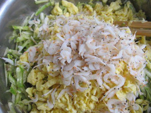 6、放入雞蛋,在加蝦皮提鮮拌勻