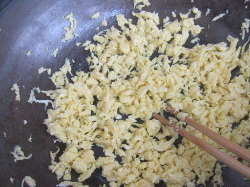 2、熱鍋熱油將雞蛋炒撒,晾涼備用