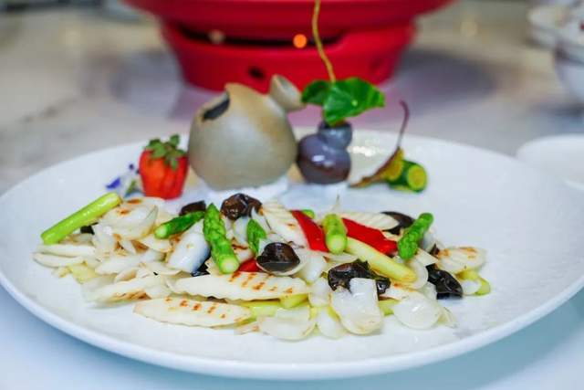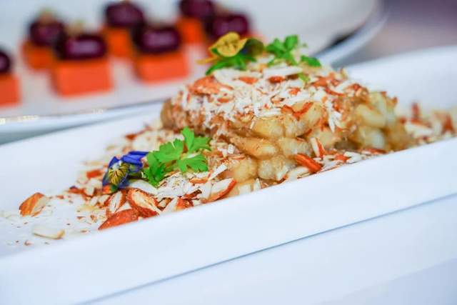 詩意麻醬秋茄,這個屬於上桌猜不出食材是什麼系列!上面撒的巴達木杏仁,做法也比較復雜,所以起名字也比較詩意,看起來也很好看,菜品看不出來辣味,但是吃起來會有些辣味!