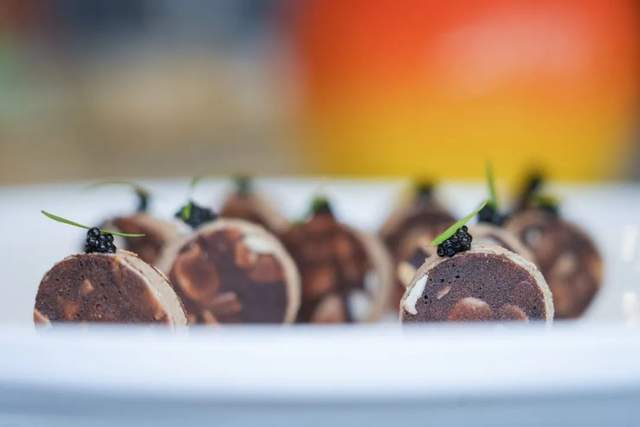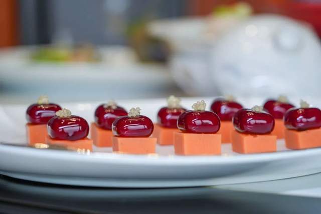 這樣的美國大鵝肝,純手工自己打醬,還加入瞭高端紅酒、黑加侖。呈現出來看到上面的魚子醬。