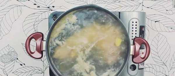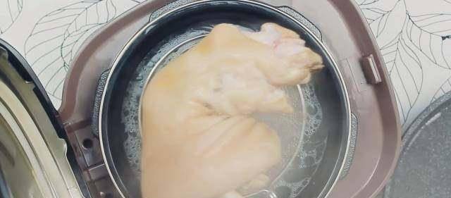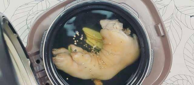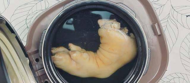 ▲豬蹄洗凈後放入高壓鍋中,水要沒過豬蹄,放入薑片,白胡椒粒,蓋上鍋蓋燉40分鐘;
