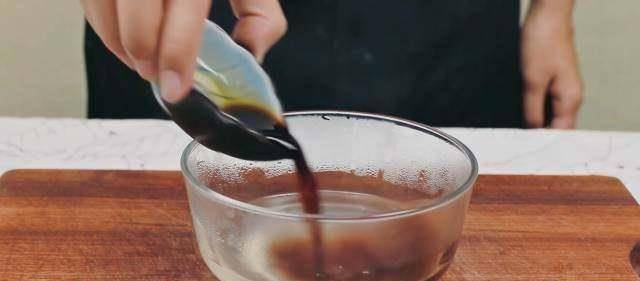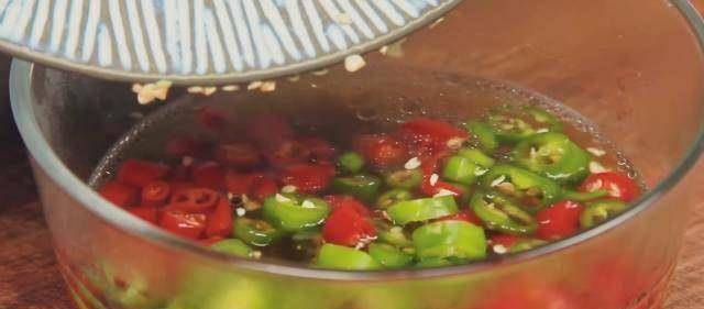 ▲40分鐘後打開鍋蓋,將豬蹄撈出放入冷水中;調一個醬汁,碗中盛4勺豬蹄湯,放入1小勺鹽,半勺白糖,3勺生抽,放入青紅椒,攪拌均勻備用;