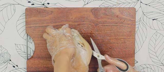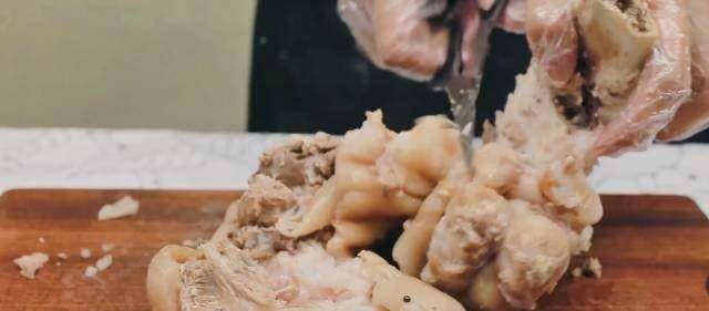 ▲豬蹄冷卻後用剪刀剔骨,沿著豬骨將肉剔出,再剪成塊,放入盛有香菜的盤子中,淋上辣椒和醬汁,這道雙椒拌豬蹄就完成啦。