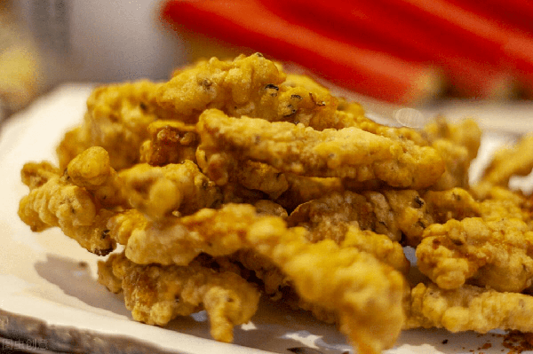 裹著面包糠炸的空氣感十足。軟嫩的的肉條藏在金黃外衣下,透過酥脆的驚喜才能與之碰面,吃酥肉一定要趁著熱乎勁趕緊吃,因為淀粉和雞蛋的緣故,使得外皮香酥而不爛,從而將豬肉的水分鎖住,以至於豬肉的口感不會特別幹。