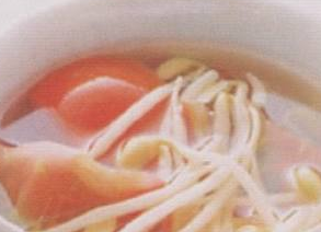 材料:白玉菇150g、綠豆芽70g、西紅柿一個、薑5g、清水800ml、鹽3g、香油1ml。