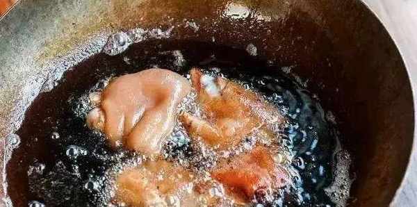 5、開油鍋,油溫八成熱下入豬蹄,炸到豬蹄表面起白皮倒出(註意這一步最好拿蓋子蓋住,否則油會噴出來)