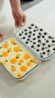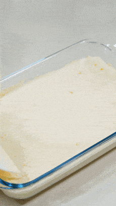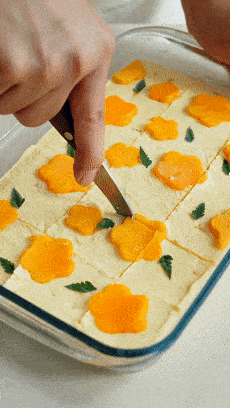對裝飾要求高一點的,表面再用芒果點綴一下,就能放入冰箱。我做這種厚切酸奶,最少也要冷凍一晚上,讓它凍得更凝實一點,最後取出來切塊就行。