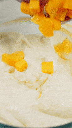孩子經常吃的稠酸奶中加上芒果泥,一塊攪拌均勻。酸奶你們盡量選配料好的,足夠濃稠的老酸奶,這樣做出來的口感更好,也不會有什麼冰碴感。