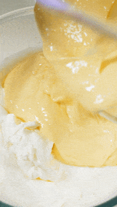 攪好的果泥酸奶兌到淡奶油中,拌勻。最開始切好的芒果丁,這時候也可以加進去瞭,別一次加太多瞭,我這個量,你們再加80克果肉丁就夠瞭。