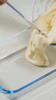 你們有模具就用模具,沒有模具的就找一個大碗或者是大盤子,將做好的果泥酸奶倒進去抹平。