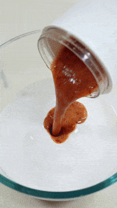 然後給酸奶中加上櫻桃泥,攪勻瞭再倒入淡奶油中。