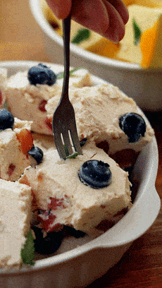 就比如說我今天做的這個鮮果厚切酸奶,配料就是水果、酸奶和配料好的奶油!