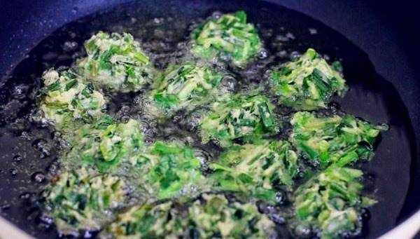 熱鍋燒油等油溫升起,轉文火把韭菜用手團成一個丸子的形狀,在放到油鍋裡炸,轉到中火炸4分鐘就可以瞭,要來回的翻到一下,要讓兩邊炸制均勻,炸好後就可以出鍋瞭,放到笊籬上控幹水分。