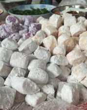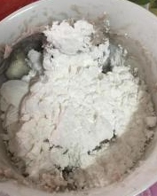 加入土豆粉,想吃芋頭味濃的,不要那麼Q的可以少放土豆粉,反之,要吃Q一點的就加多一點粉,先用手揉一下面,然後加入70度左右的水,一起和面,要趁熱,和好面馬上揉成條,散上幹粉,切塊,或者揉圓。