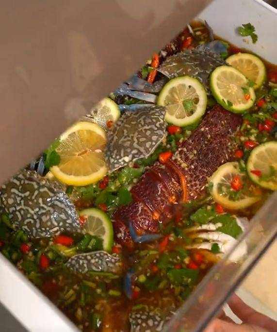 嚴素在視頻中買的就是活海鮮,兩隻波龍,外加幾隻蘭花蟹,她將海鮮處理好之後,加上調料放在冰箱進行醃制,經過醃制之後,嚴素便直接將龍蝦和螃蟹上桌,就這樣進行生吃,引起瞭不少的爭議。