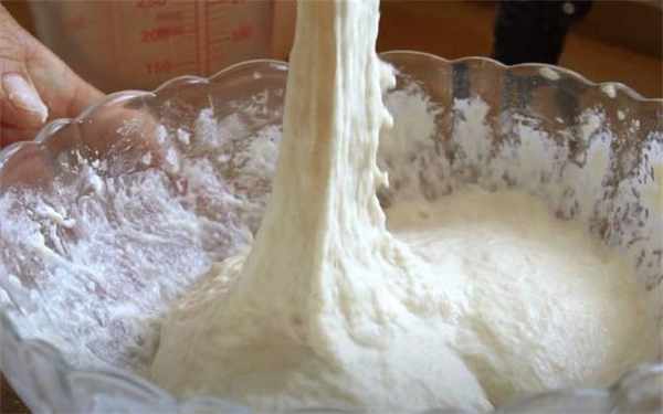 1.準備300g面粉,3g酵母粉,一勺鹽增加面粉的筋性,用溫水和面,水要慢慢加,順著一個方向攪拌成粘稠無顆粒的面糊,像這樣拉著有韌勁就可以,面糊攪拌好之後密封餳發半個小時。