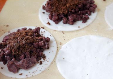 下面就開始和面瞭,建議大傢使用糯米粉,做出來的會更加的好吃,在糯米飯裡面加一些水,然後把它揉成面團,然後把它們分成一個個的小面團,用搟面杖把他們搟成圓餅,接著把之前煮好的紅豆敷在上面,你可以嘗一下紅豆,如果覺得甜味不夠的話,可以再放一些紅糖進去。
