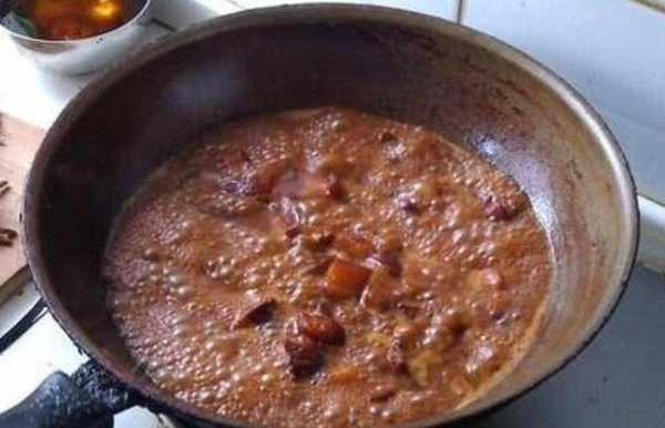 第4步,起鍋加入少許的食用油,油熱以後下入幾塊冰糖,先將冰糖炒化,然後再用小火將冰糖慢慢熬制棗紅色時,下入五花肉快翻炒均勻。