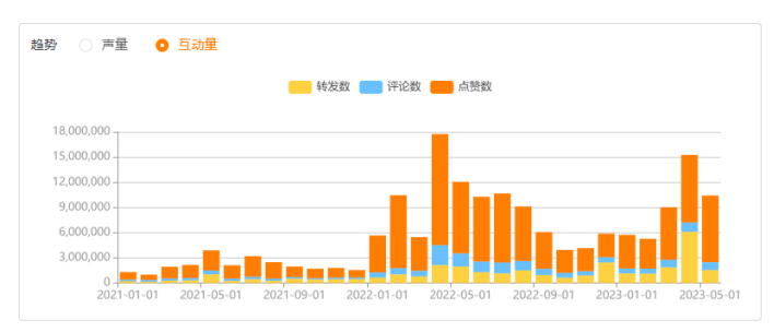 2021年1月-2023年5月抖音、微博、小紅書平臺酸奶飲品相關推文互動量走勢