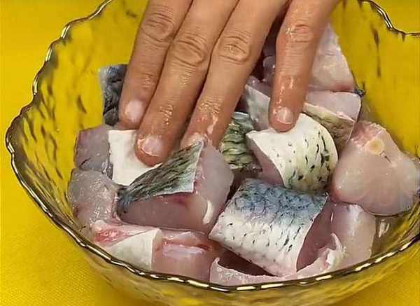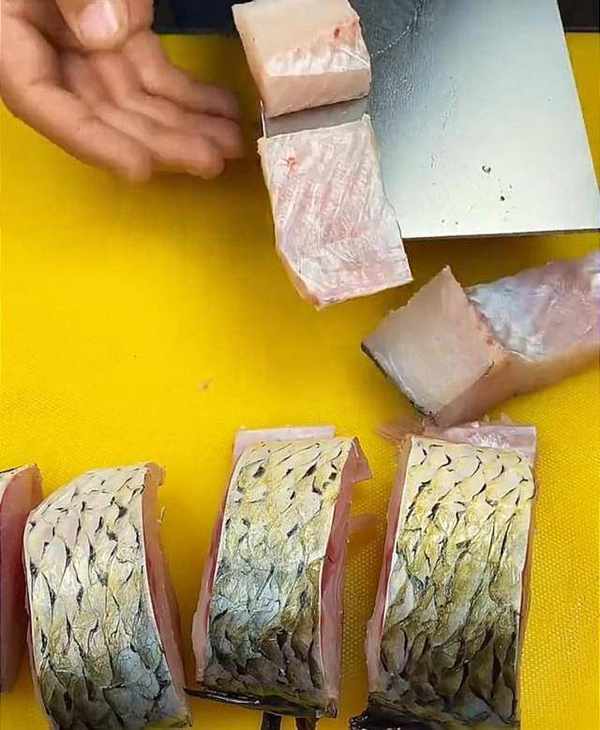 然後,將魚給它砍成兩厘米的大段,再切成小塊,這樣更好的方便入味。全部切好之後,放入碗中備用。