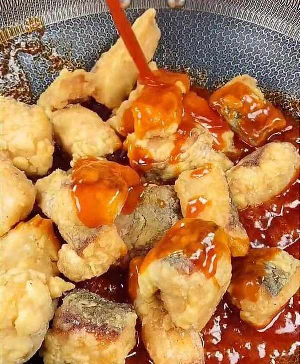 然後,鍋中留底油,倒入調好的料汁,大火給它熬開,熬制湯汁濃稠,下入剛炸好的魚塊,快速的翻炒均勻,出鍋裝入盤中即可食用。