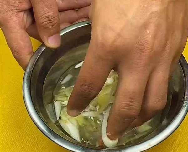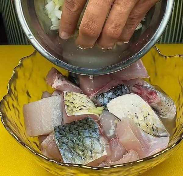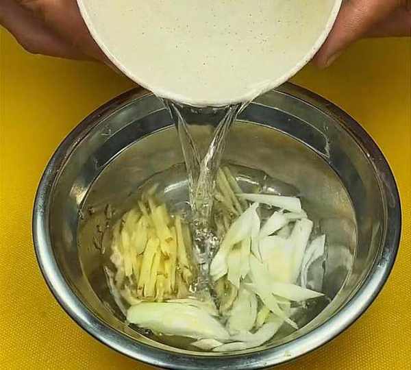 接著,空碗中加入蔥和薑,再倒入溫水,用手抓出蔥薑水。將抓出的蔥薑水倒入魚塊中,再加入一勺精鹽,將魚進行醃制15分鐘,這樣做出來的魚吃起來口感不腥。