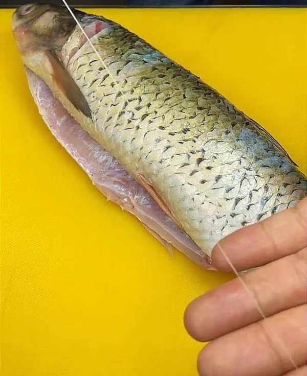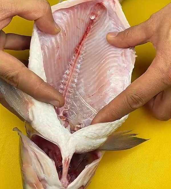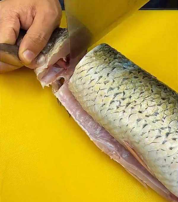 做糖醋魚,一定要把魚的腥線給它抽出來,從魚頭魚尾各劃一刀,慢慢地將魚腥線完整地給它拽出。