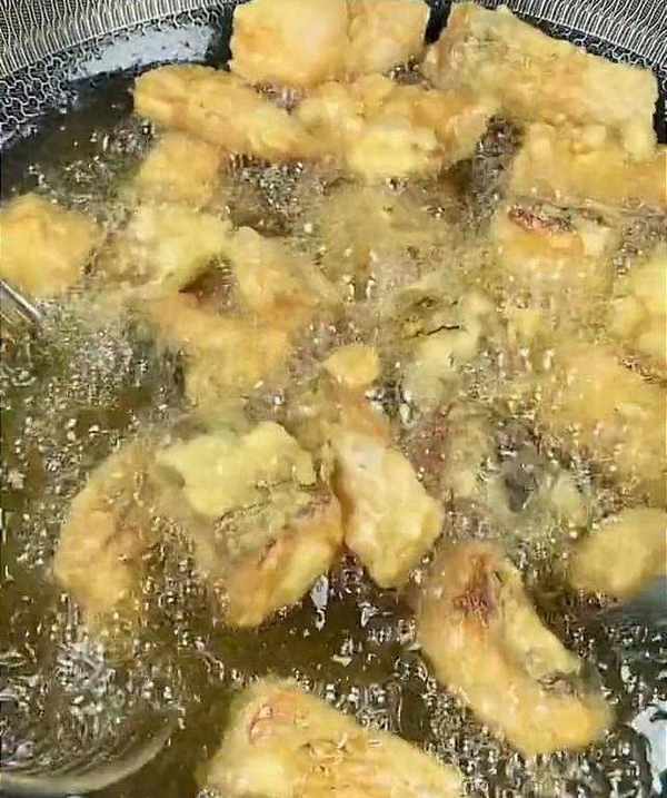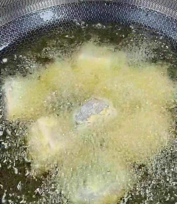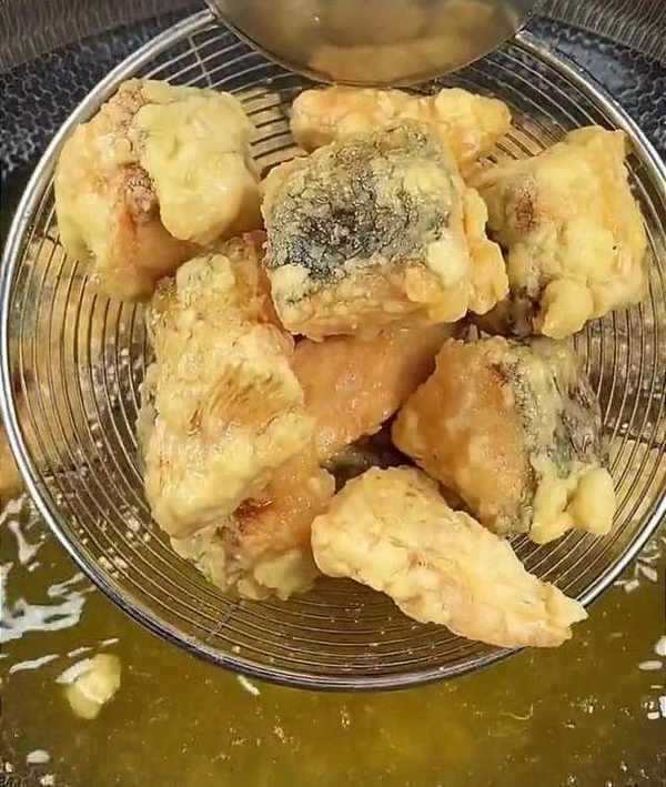 接著,鍋中倒入稍多一點的食用油,油溫五成熱時,下入魚塊,一個一個地下入。下入之後,先不要著急攪動,小火慢炸,炸至表面顏色金黃酥脆,即可把魚塊撈出控油。