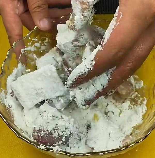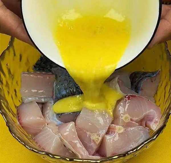 然後,再準備空碗,打入一個雞蛋,用筷子將雞蛋充分的攪散,攪散之後倒入魚塊中,讓每一個魚塊都均勻地沾上一層蛋液,再加入一大勺的玉米淀粉,用手給它抓均勻,使每個魚塊上都粘上淀粉。