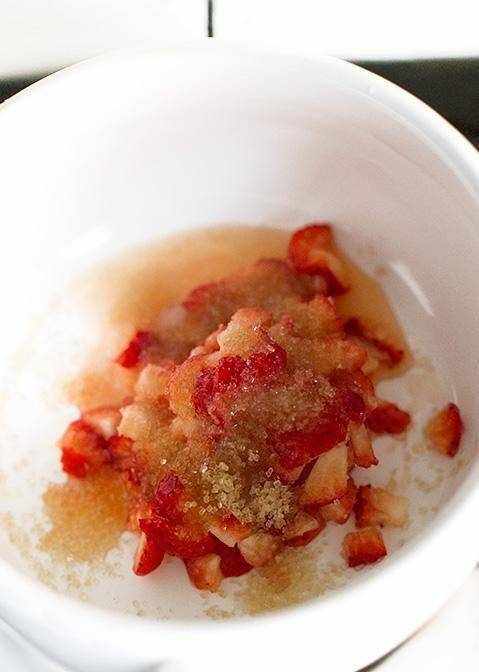 將6顆草莓小丁、檸檬汁、砂糖和薄荷葉放入耐酸的小鍋,以小火慢慢熬煮至微微濃稠(約數分鐘),