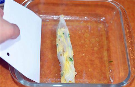 11.用刮板如下圖從一端刮起堆成條狀,腸粉自然就卷起來瞭。