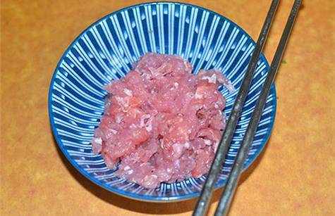 2.將豬肉餡裡加少許食鹽和胡椒粉拌勻,醃制入味10分鐘備用。