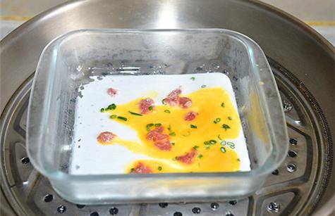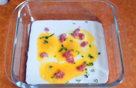 7.準備一個平底的容器,容器舀入適量米漿,薄薄一層即可,淋入蛋液放少許肉餡,撒入香蔥碎。