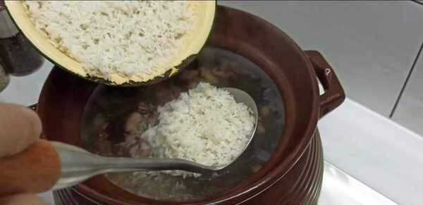 4、魚骨湯熬煮20分鐘後,將柴魚皮和骨撈起來,放入泡好的米,花生和柴魚肉中小火煮50-70分鐘。