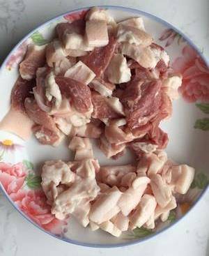 2、五花肉切好,條狀片狀都可以,肥瘦也可分開,肥的先在鍋裡炸出油。